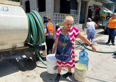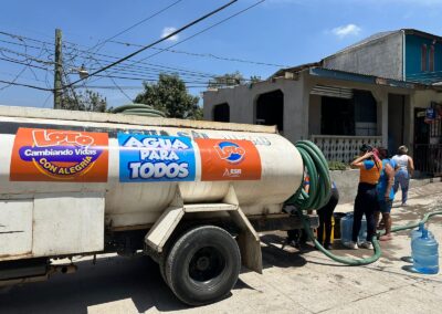 Esta acción se realizó en la pulpería Sara, donde el camión cisterna llegó para repartir el agua entre los vecinos que se acercaron y que agradecieron esta acción ya que esto garantiza el acceso al recurso para los próximos días.