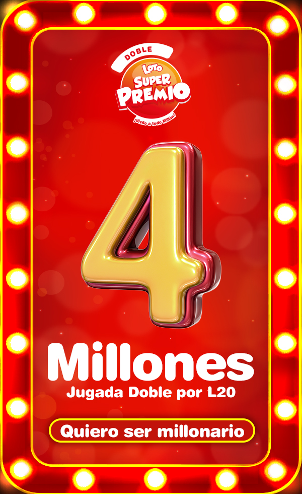 - Puedes jugar “Loto” bajo la modalidad de “Jugada Doble” realizando una postura de L20 por cada jugada de seis (6) números seleccionados. El premio bajo la modalidad de “Jugada Doble” es un monto adicional igual al Loto SuperPremio, únicamente cuando se aciertan los 6 números.