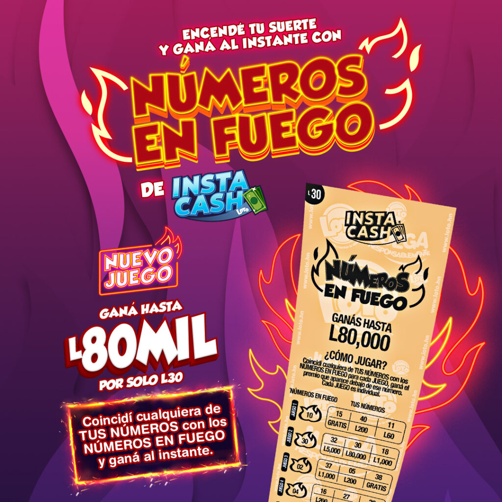 Para jugar unicamente debes pedir en tu punto de venta de preferencia un boleto de «Números en Fuego» estas participando para ganar hasta L. 80 mil al instante, solo tenes coincidir cualquiera de tus números con los números en fuego para cada juego gana el premio que aparece debajo de ese número. Cada juego es individual.